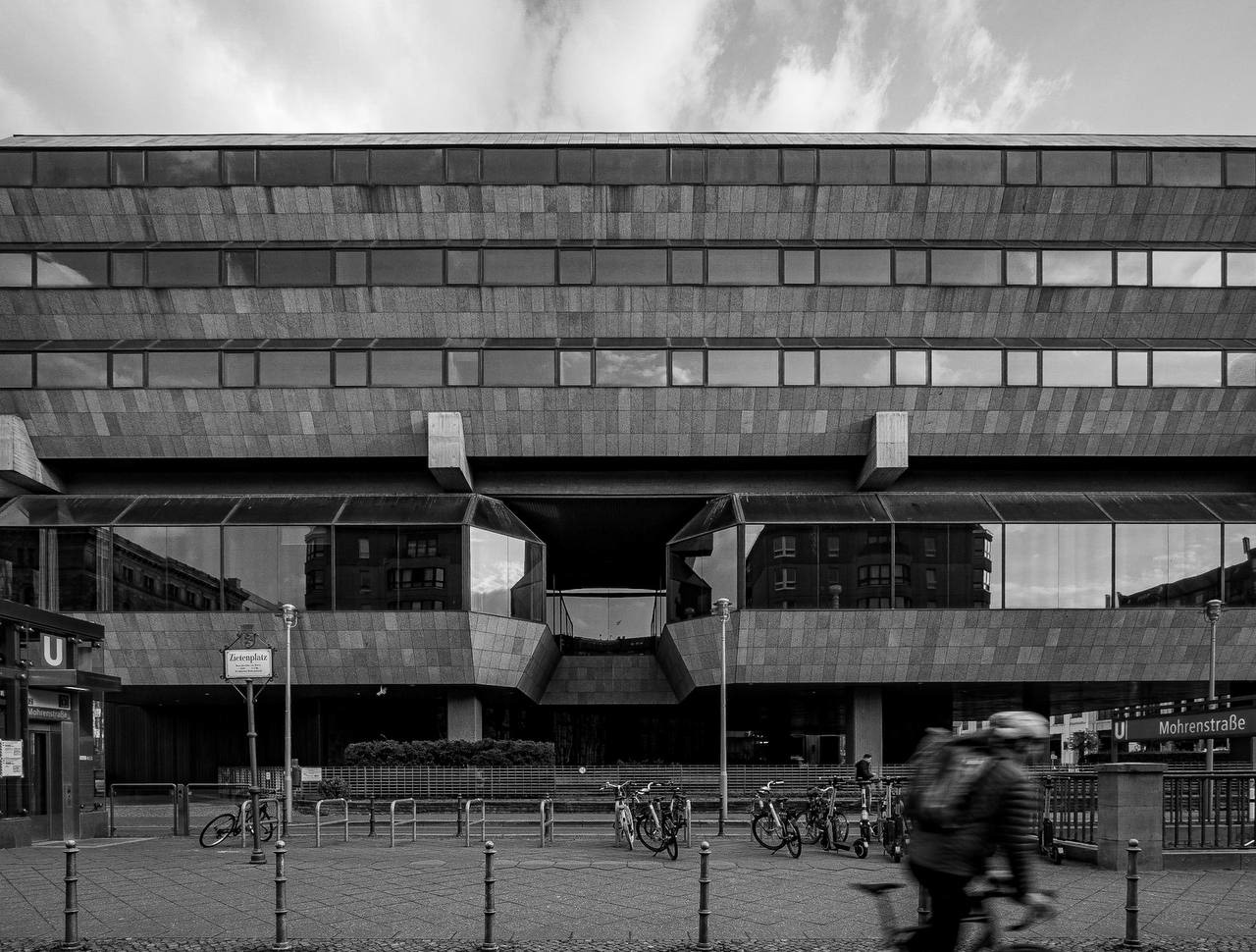 The former building for the Czechoslovakian Embassy was constructed on the former Wilhelmplatz (later Thälmannplatz) in East Berlin between 1974 and 1978, and was inaugurated in February 1979. The design was created by Czech architects Věra and Vladimír Machonin, in collaboration with Klaus Pätzmann. The building features a square layout with 48-meter long sides. Its first floor extends significantly over the ground floor and entrance, giving the impression of a floating structure. Angular, dark mirrored windows lend a futuristic appearance.